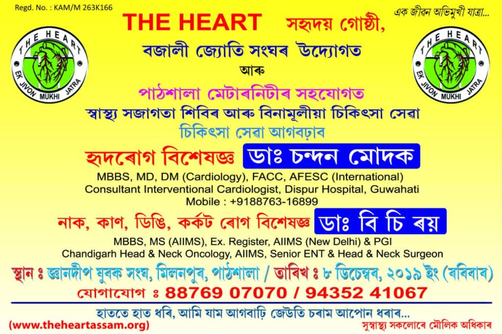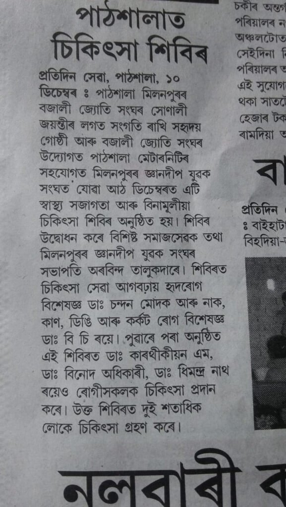 Free Health Check up, Treatment, Health awareness Programme at Gyandeep Yuba Hangha, Milanpur, Pathsala on 8th December, 2019